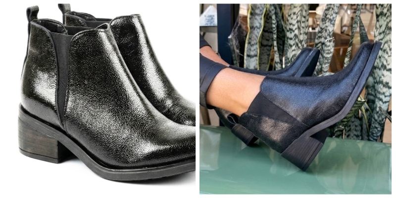 Confeccionada con cuero graneado de terminacion acharolada y elástico en ambos laterales para facilitar el calce.